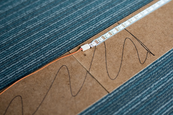 The CandyBar was built in pieces that could all be disassembled and reassembled atop the ledge. The plan was to use strips of hardboard cut into 8-foot segments. Hardboard is sturdy enough to house LED strips, but lightweight enough that it wouldn’t put strain on the ledge.