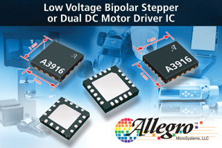 Allegro MicroSystems' A3916 is designed for pulse-width-modulated (PWM) control of low voltage stepper motors and single and dual DC motors. The A3916 is capable of output currents up to 1 A per channel and operating voltages from 2.7 V to 15 V. The A3916 has an internal fixed off-time PWM timer that sets a peak current based on the selection of a current sense resistor. An output fault flag is provided that notifies the user of a TSD or overcurrent protection event. The A3916 is supplied in a low-profile 3 mm x 3 mm 16-terminal QFN and in a low-profile 4 mm x 4 mm 20-terminal QFN, both with exposed power tab for enhanced thermal dissipation. The A3916 replaces the A3906 with additional needed features to remain competitive with parts from other manufacturers.